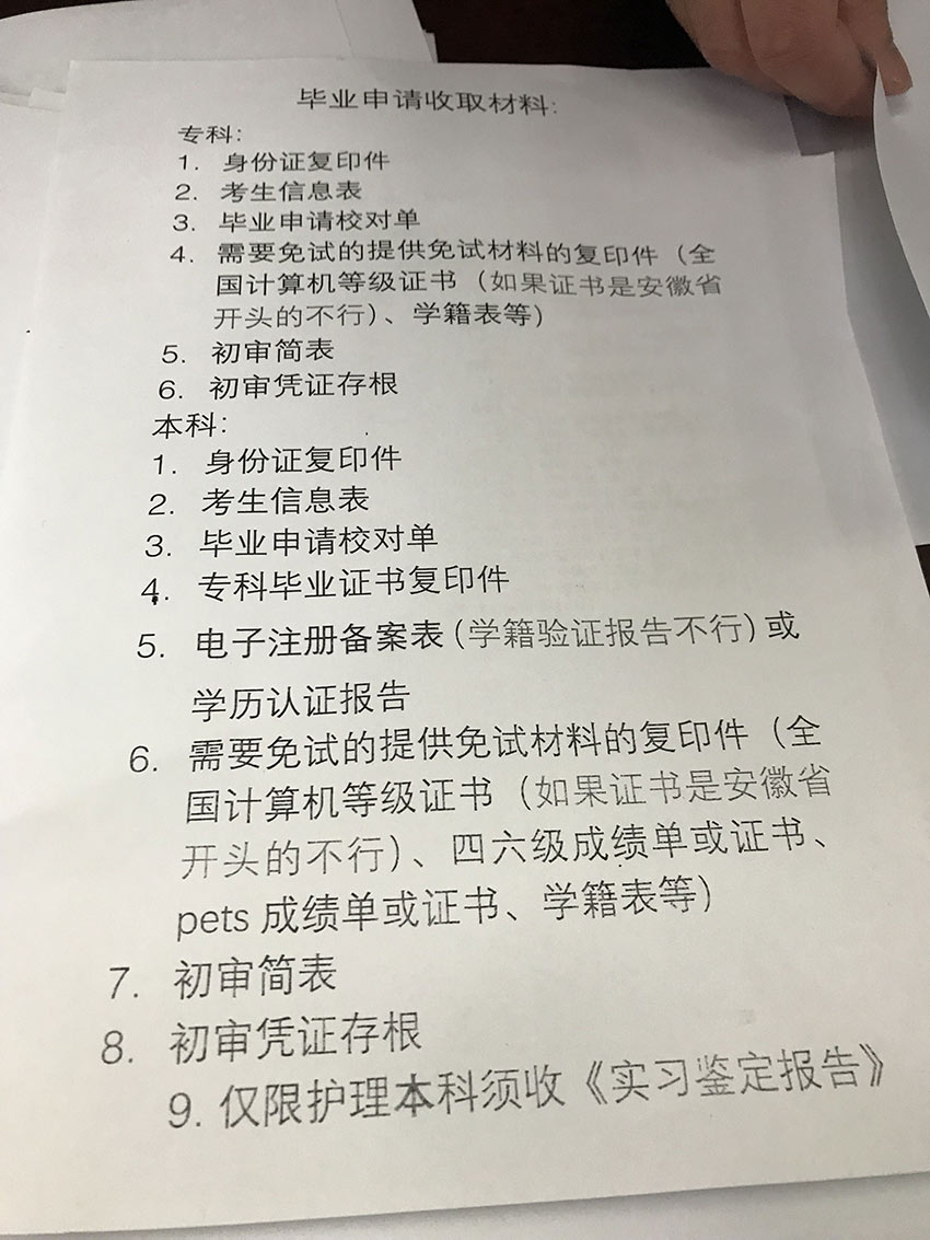 需要申请毕业的自考同学需要注意了,我们需要准备哪些材料呢?现在李老师经过现场勘测,偷偷的给大家拍下来,自考申请毕业所需材料,请大家到合肥自考办申请毕业带好这些材料: